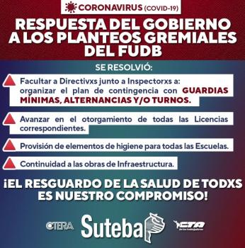 El Frente de Unidad Docente Bonaerense fue convocado a una reunión con la Directora General de Cultura y Educación, la Ministra de Trabajo, el Ministro de Salud y el Jefe de Gabinete de la provincia de Buenos Aires.