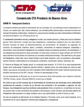 Lilian Capone, Secretaria de Salud Laboral de la CTA Provincia de Buenos Aires, sostuvo al respecto: «Estamos preocupadxs porque hay Trabajadorxs expuestxs directamente al riesgo de contagio y exponen su vida con este virus muy peligroso. Planteamos que el coronavirus sea considerado como enfermedad profesional y que toda su cobertura de tratamiento, rehabilitación y posible incapacidad sean contempladas por Aseguradoras de Riesgos del Trabajo. Actualmente, la definición de la Superintendencia de Riesgos del Trabajo es que la enfermedad profesional es reconocida caso por caso con trámites que deben hacer lxs Trabajadorxs. Estamos en una emergencia, no hay tiempo para trámites».
