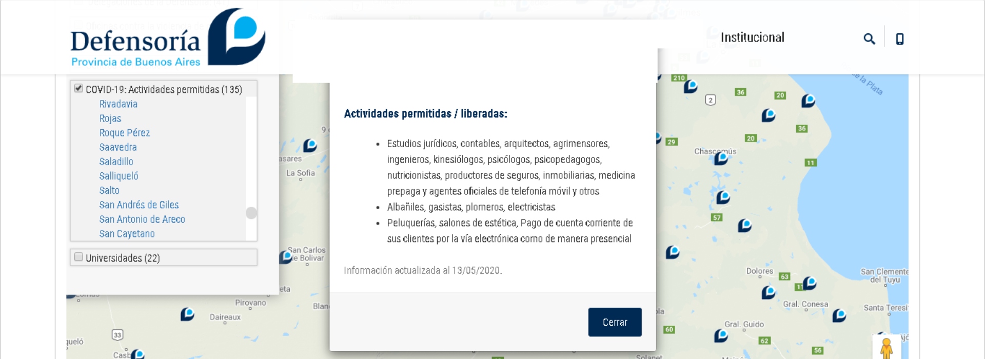 La Defensoría del Pueblo bonaerense elaboró un mapa interactivo que actualiza día a día la información sobre las actividades habilitadas en cada uno de los municipios de la Provincia en medio del aislamiento social, preventivo y obligatorio dispuesto debido al coronavirus.