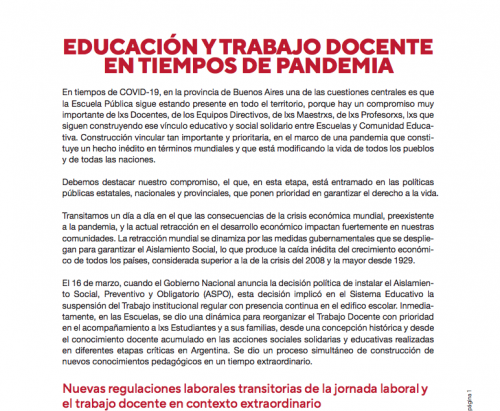 En tiempos de COVID-19, en la provincia de Buenos Aires una de las cuestiones centrales es que la Escuela Pública sigue estando presente en todo el territorio, porque hay un compromiso muy importante de lxs Docentes, de los Equipos Directivos, de lxs Maestrxs, de lxs Profesorxs, lxs que siguen construyendo ese vínculo educativo y social solidario entre Escuelas y Comunidad Educativa. Construcción vincular tan importante y prioritaria, en el marco de una pandemia que constituye un hecho inédito en términos mundiales y que está modificando la vida de todos los pueblos y de todas las naciones.
