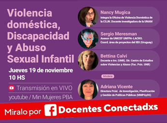 Este jueves 19 de noviembre, a las 10 hs, lxs invitamos a la charla «Violencia doméstica, Discapacidad y Abuso Sexual Infantil», donde expondrán Nancy Mugica, Sergio Meresman y Bettina Calvi, con Adriana Vicente como moderadora.