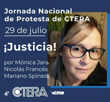 CTERA convoca este jueves 29 de julio a una Jornada Nacional de Protesta para exigir justicia por Mónica, Nicolás y Mariano. En las Escuelas de todo el país se harán acciones para acompañar a la Comunidad Educativa, a las familias y a ATEN en este reclamo.