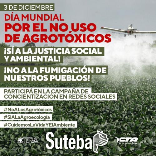 El SUTEBA adhiere al Día Mundial por el No Uso de Agrotóxicos, que se celebra mañana para recordar la muerte de 8000 personas en Bhopal, India, al derramarse 45 toneladas de venenos en una planta de pesticidas el 3 de diciembre de 1984.