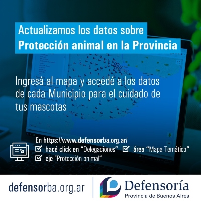 La Defensoría del Pueblo bonaerense actualizó su plataforma virtual para conocer todos los lugares de vacunación, atención veterinaria pública, adopción de mascotas, refugios y ordenanzas sobre los derechos de los animales en los 135 municipios de la Provincia.