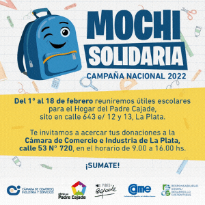 La Cámara se suma a la campaña impulsada por La Confederación Argentina de la Mediana Empresa (CAME), que por sexto año consecutivo, lleva adelante la campaña nacional “Mochi Solidaria”. Esta iniciativa, que nació en el año 2017, acompaña a diferentes organizaciones sin fines de lucro a acercarle a niños y niñas los materiales necesarios para el comienzo de su año lectivo.