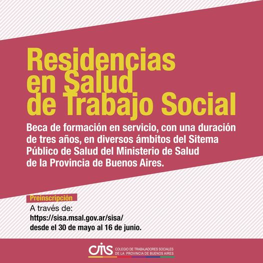 Informamos que hasta el día 16 de junio se encuentra abierta la preinscripción a las residencias en salud de Trabajo Social