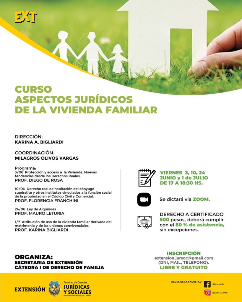 Informamos que se encuentra abierta la inscripción al «Curso Aspectos Jurídicos de la vivienda familiar», organizado por la Secretaría de Extensión Universitaria y la Cátedra I de Derecho de Familia, el mismo se llevará a cabo los días viernes 3, 10, 24 de junio y 1 de julio de 17 a 18:30 hs. a través de la plataforma ZOOM.