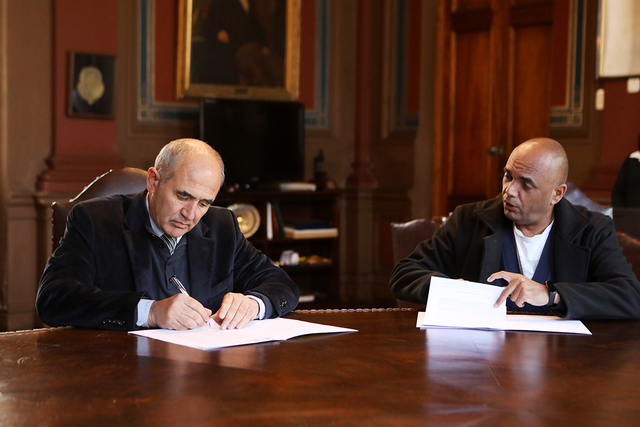 El presidente de la UNLP, Martín López Armengol, firmó hoy un convenio con el titular de Everton, Marcelo Fortes, para garantizar la continuidad del servicio destinado a los estudiantes de esta casa de estudios. Durante la rúbrica del acuerdo, también estuvo presente el director del Comedor, Bruno Carullo.