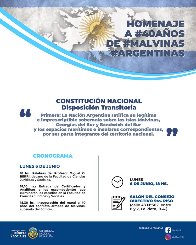 La Facultad de Ciencias Jurídicas y Sociales invita a participar del Homenaje a #40años de #malvinas #argentinas el día lunes 6 de junio a las 18hs. en el Salón del Consejo Directivo 5to Piso (Calle 48 entre 6 y 7).