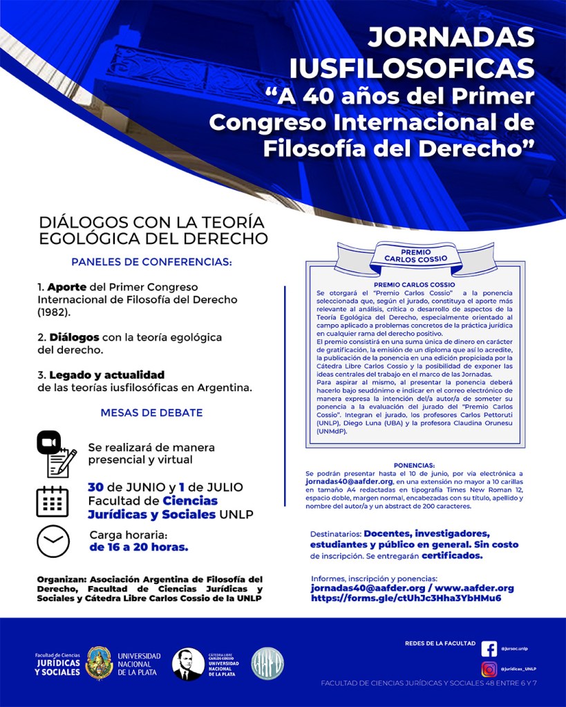 Organizan: Asociación Argentina de Filosofía del Derecho, Facultad de Ciencias Jurídicas y Sociales de la Universidad Nacional de La Plata y la Cátedra Libre Carlos Cossio.