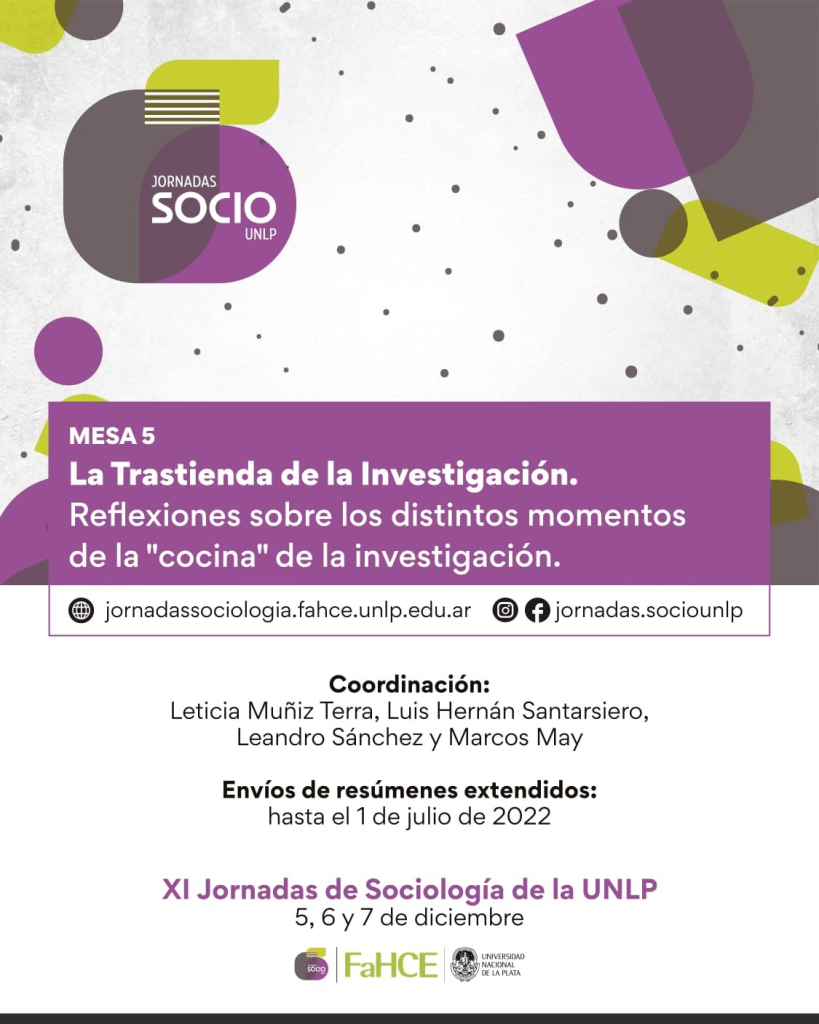 Les acercamos esta invitación a participar dentro de la Mesa 5 – «La Trastienda de la Investigación. Reflexiones sobre los distintos momentos de la ‘cocina’ de la investigación.» Dentro del marco de las XI Jornadas de Sociología de la Universidad Nacional de La Plata | UNLP que tendrá lugar entre el 5 y el 7 de diciembre.