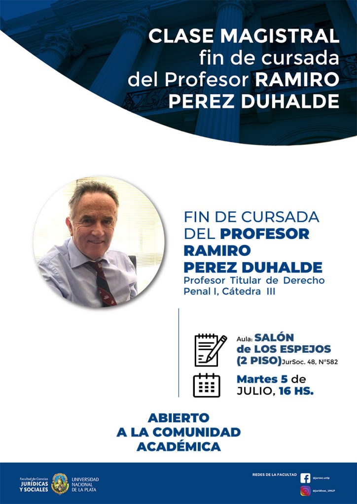 La Facultad de Ciencias Jurídicas y Sociales invita a la comunidad académica a participar de la CLASE MAGISTRAL – FIN DE CURSADA DEL PROFESOR RAMIRO PÉREZ DUHALDE, Profesor Titular de la Cátedra 3 de Derecho Penal I de la Facultad de Cs. Jurídicas y Sociales de la UNLP, y docente de posgrado en la Carrera de Especialización en Derecho Penal de la Universidad Nacional de La Plata.