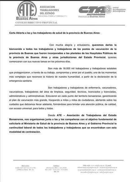ATE provincia de Buenos Aires le da la bienvenida a las y los trabajadores de las postas de vacunacion que han sido incorporados al nuevo programa de capacitación y, han ingresado a los hospitales públicos de la provincia de Buenos Aires.