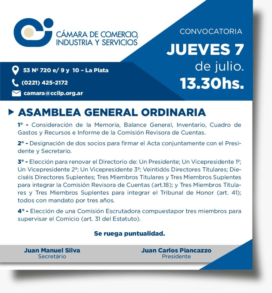 6 julio, 2022 clipurbanodenoticias La Cámara de Comercio, Industria y Servicios llevará adelante su Asamblea Ordinaria en La Plata /Difusión Cámara de Comercio, Industria y Servicios/ Asamblea General Ordinaria, convocatoria. Comparte esto: Compartir en X (Se abre en una ventana nueva) X Comparte en Facebook (Se abre en una ventana nueva) Facebook Más Compartir en LinkedIn (Se abre en una ventana nueva) LinkedIn Compartir en Tumblr (Se abre en una ventana nueva) Tumblr Haz clic en Pinterest (Se abre en una ventana nueva) Pinterest Compartir en Telegram (Se abre en una ventana nueva) Telegram Compartir en WhatsApp (Se abre en una ventana nueva) WhatsApp Me gusta Cargando...