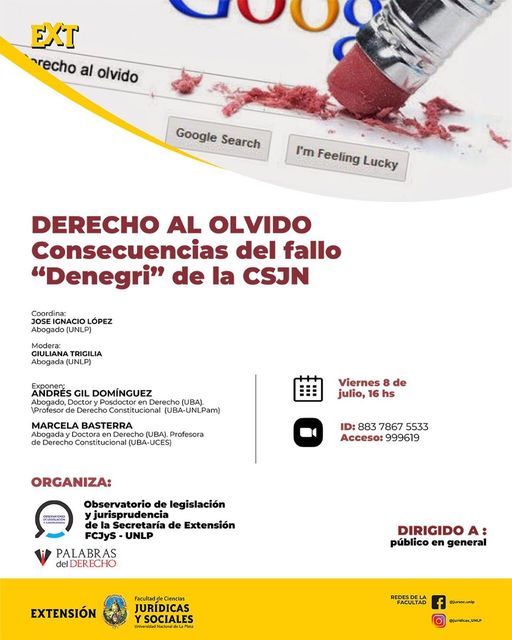 La Secretaría de Extensión Universitaria invita a participar de la Jornada Derecho al olvido. Consecuencias del fallo “Denegri” de la CSJN, la cual se llevará a cabo el viernes 8 de julio a las 16 hs. de manera virtual por Plataforma Zoom.