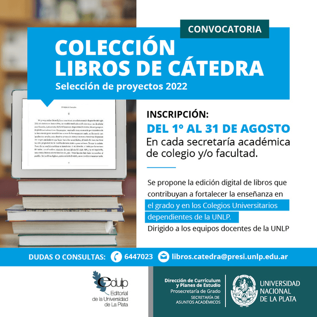 Del 1º al el 31 de agosto estará abierta la convocatoria para la selección de proyectos 2022 de la Colección Libros de Cátedra. Está destinada a profesores y equipos docentes de los colegios y facultades de la Universidad Nacional de La Plata.