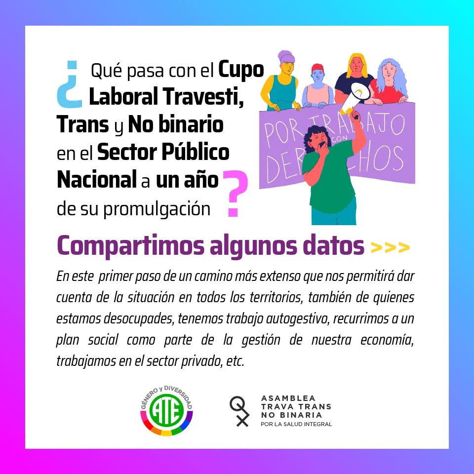 El 8 de julio de 2021 se promulgaba la Ley Nacional 27.636 de Cupo e Inclusión Laboral Travesti, Trans y No Binario, que estableció una reserva del 1% de la planta de trabajadorxs de la Administración Pública Nacional para este colectivo histórica y estructuralmente vulnerado en sus derechos más elementales.