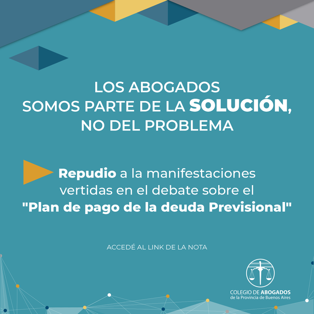 Sobre trascendidos periodísticos en el marco del tratamiento del Proyecto de Ley sobre “Plan de Pago de Deuda Previsional” y el rol de las abogadas y abogados, el Colegio de Abogados de la provincia de Buenos Aires, a través de su comisión de Derecho previsional, pone de manifiesto que: