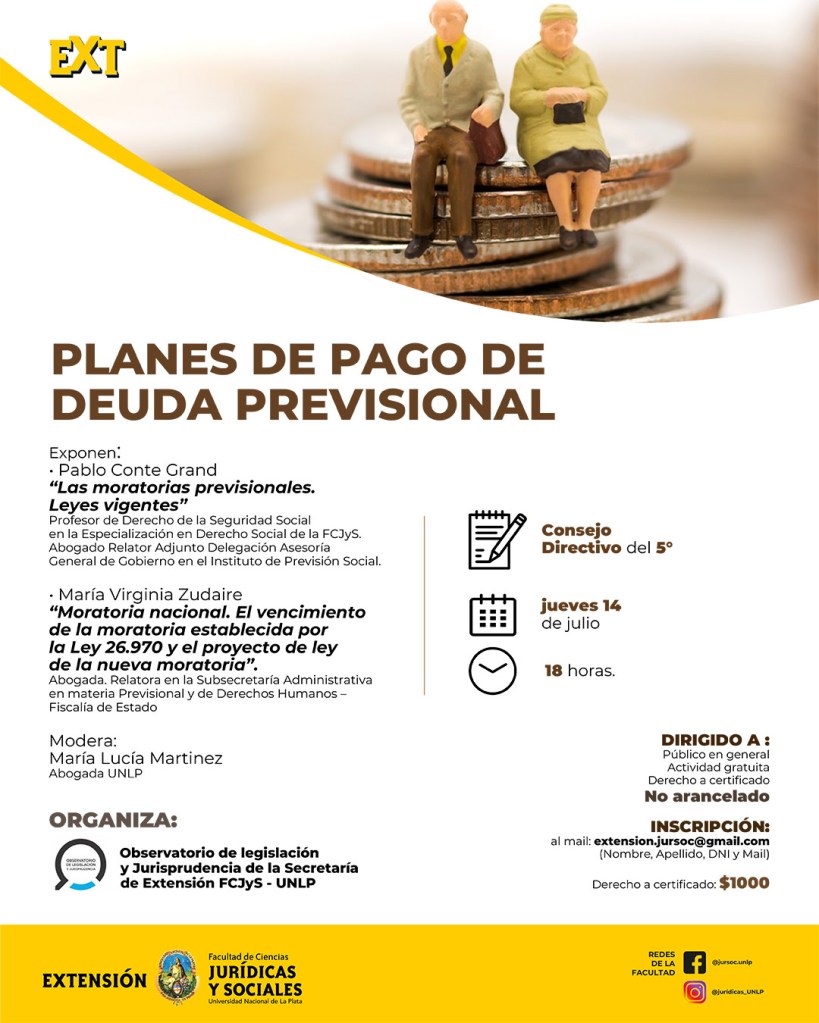 La Secretaría de Extensión Universitaria invita a participar de la Jornada «Planes de pago de deuda previsional», la cual se llevará a cabo el jueves 14 de julio a las 18 hs. de manera presencial en el Consejo Directivo del 5° piso Edificio de la Reforma.