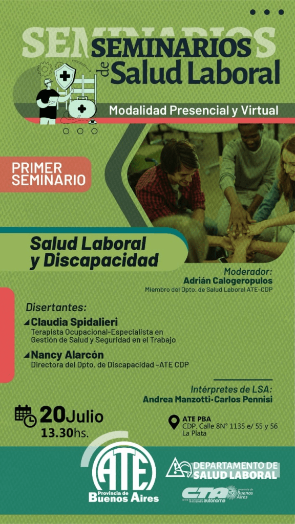Desde el Departamento de Salud Laboral ATE-CDP les invitamos del 1er encuentro del Ciclo de Seminarios. En esta oportunidad abordaremos «Salud Laboral y Discapacidad»