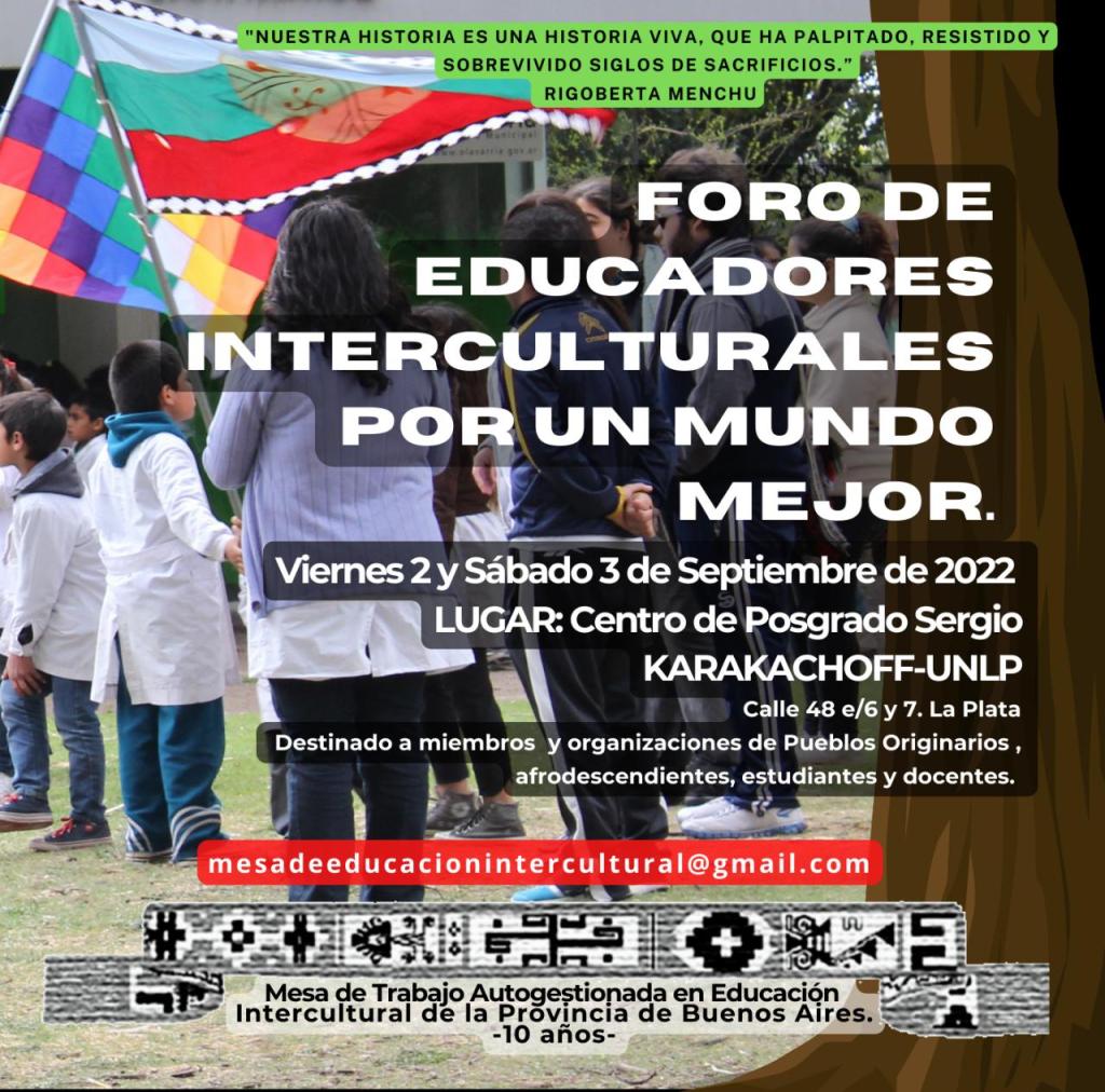 Socializamos información del Foro de Educadores Interculturales por un mundo mejor organizado por la Mesa de Trabajo Autogestionada en Educación Intercultural de la Provincia de Buenos Aires. Dicho foro se realizará en la ciudad de La Plata los días 2 y 3 de septiembre del corriente año.