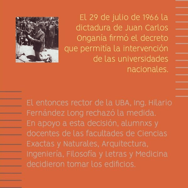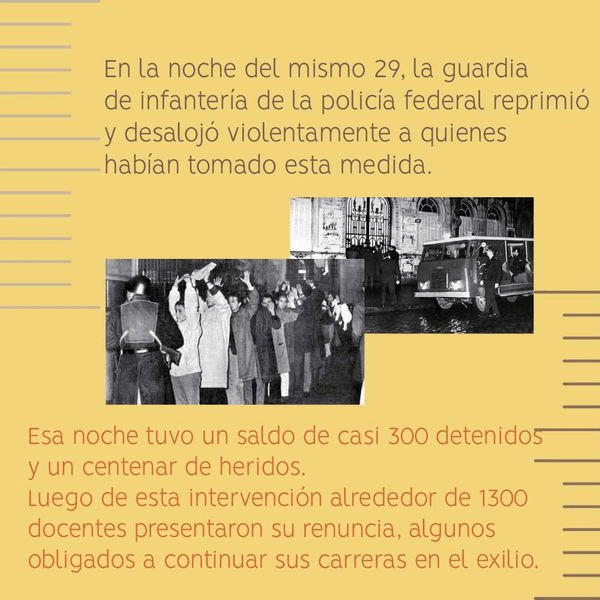 La noche del 29 de julio de 1966 la policía federal reprimió violentamente a la comunidad estudiantil que había tomado la UBA en respuesta al decreto que anulaba la autonomía universitaria. El saldo de esta noche es de más de 300 heridos y el exilio de casi 1300 docentes.