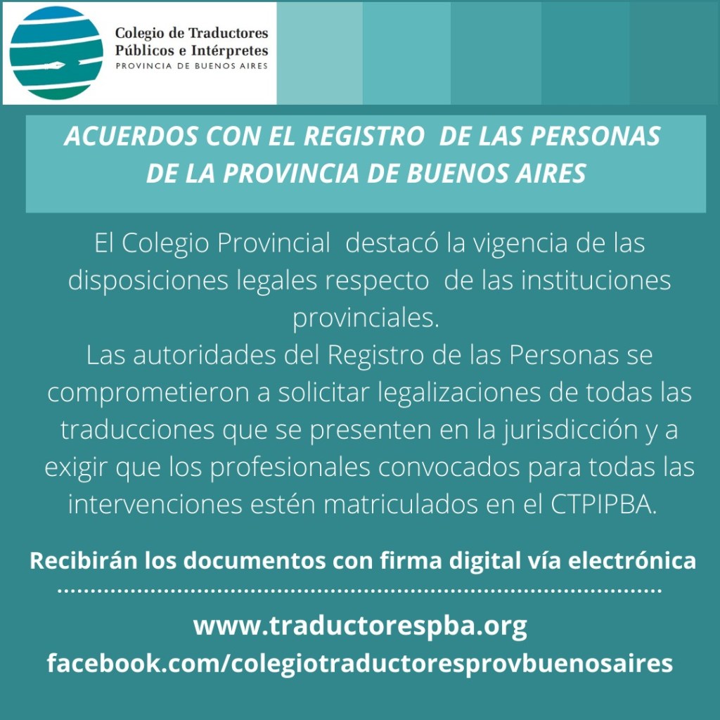 Tras una reunión realizada el 26 de Julio con los representantes del Colegio de Traductores Públicos e Intérpretes de la provincia de Buenos Aires, los representantes del Registro se comprometieron a requerir la legalización de todas las traducciones públicas que reciban y la intervención de profesionales matriculados del CTPIPBA en toda ceremonia civil que se realice en territorio bonaerense.
