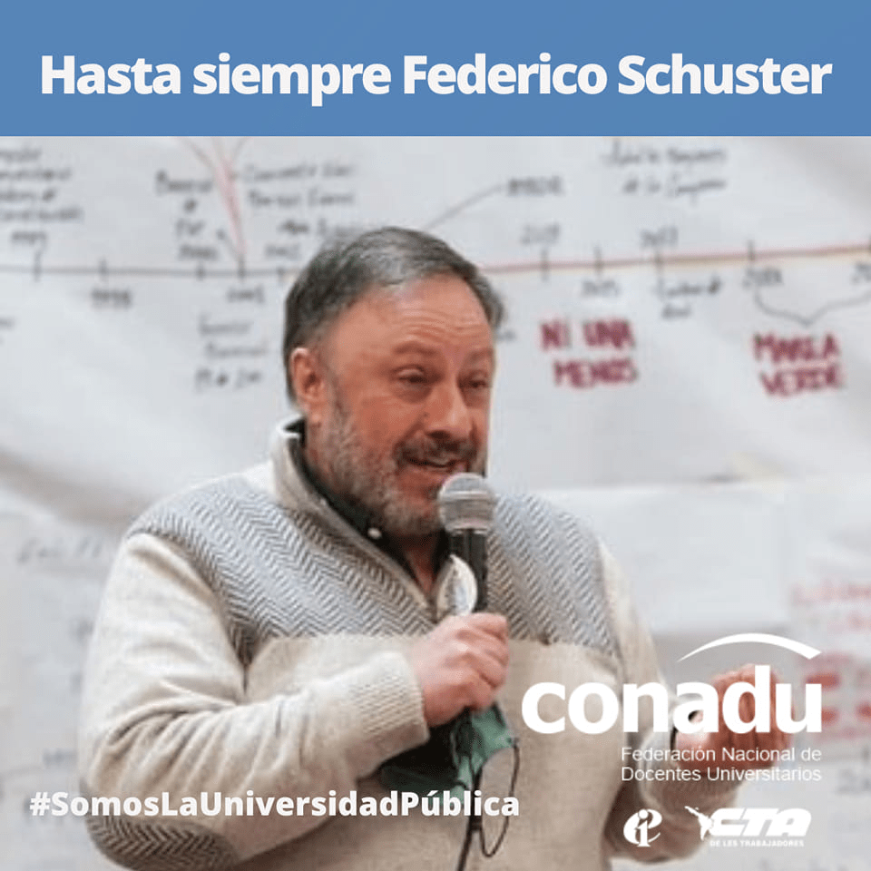 Desde la Federación Nacional de Docentes Universitarios CONADU, lamentamos el fallecimiento del compañero Federico Schuster, ex decano de la Facultad de Ciencias Sociales de la Universidad de Buenos Aires y queridísimo afiliado de Feduba – Sindicato de Docentes de la UBA. Un luchador incansable por la educación pública.