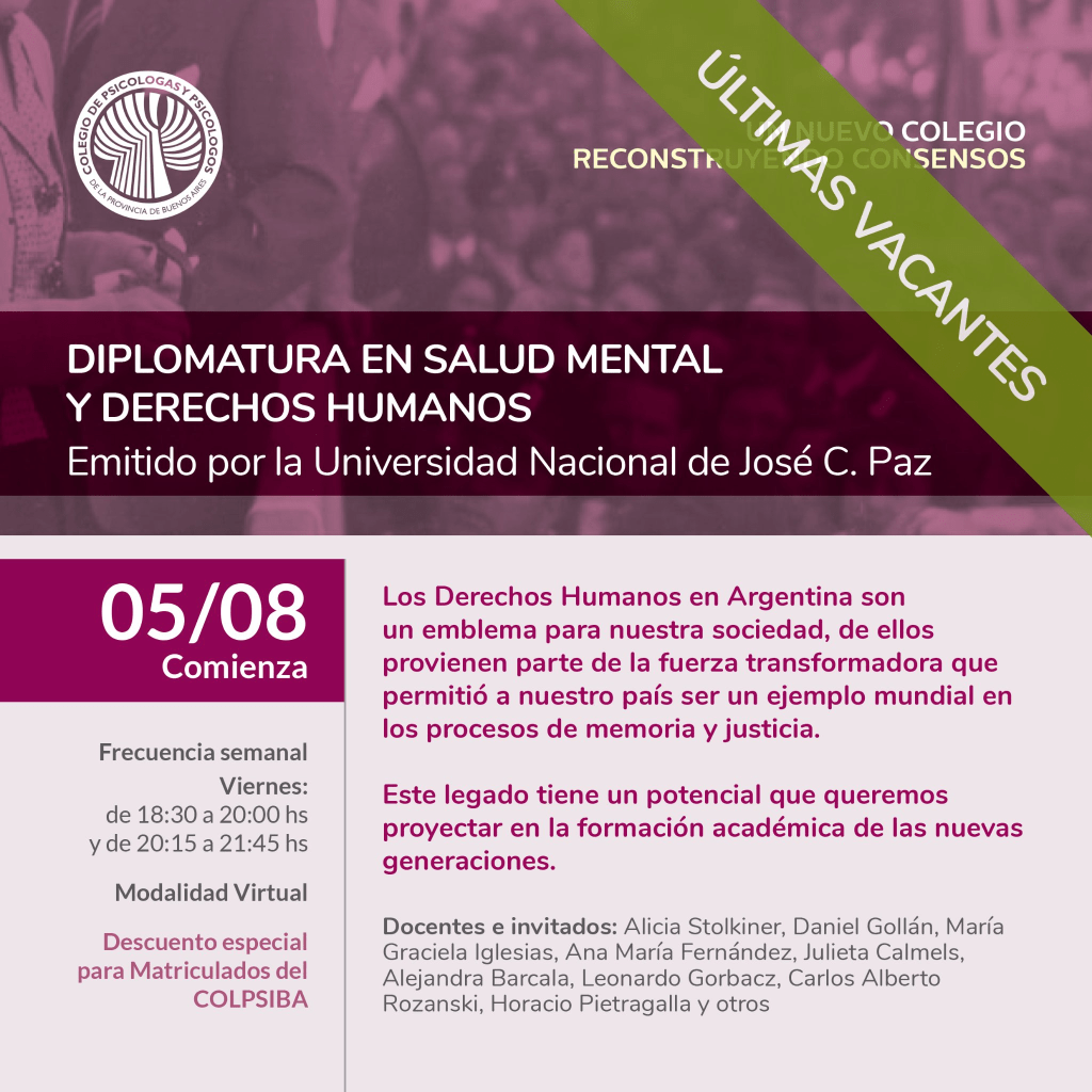 Últimas vacantes para inscribirte en la Diplomatura de Salud Mental y Derechos Humanos organizada por la Universidad Nacional de José C. Paz, FEDUBA y Enclaves AC.