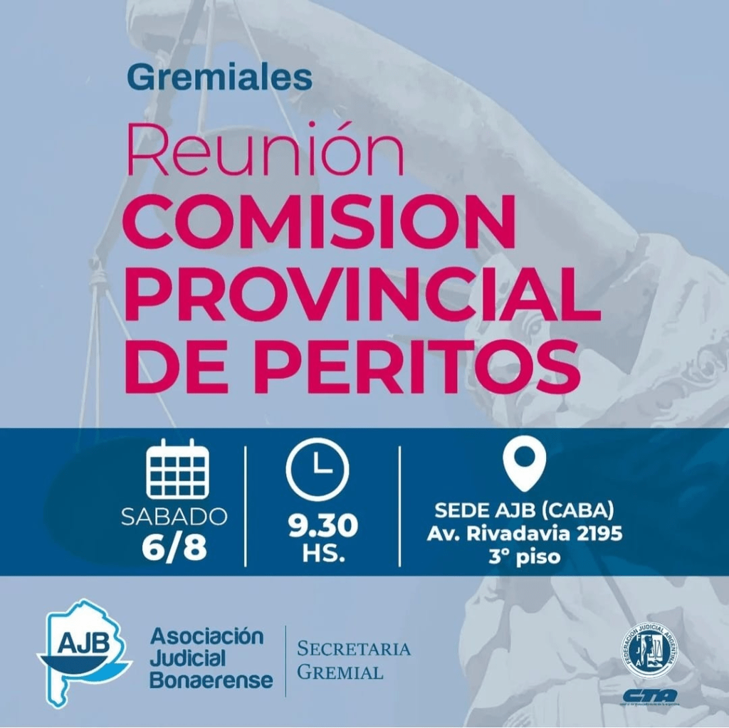 Continuando con las reuniones sectoriales organizadas por el gremio, el próximo sábado 6 de agosto a las 9.30 hs. tendrá lugar la primera reunión abierta de la Comisión Provincial de Peritos de la AJB.