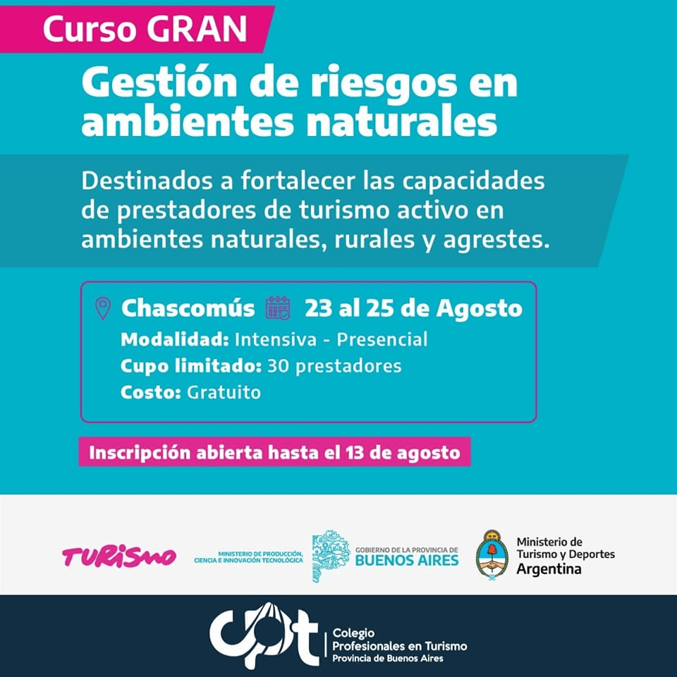 El Ministerio de Turismo y Deportes de la Nación, en convenio con la Asociación Argentina de Ecoturismo y Turismo Aventura (AAETAV), y la Subsecretaría de Turismo – PBA -, abrieron la inscripción al curso de “Gestión de Riesgos en ambientes naturales” a realizarse en la ciudad de Chascomús, desde el 23 al 25 de agosto.