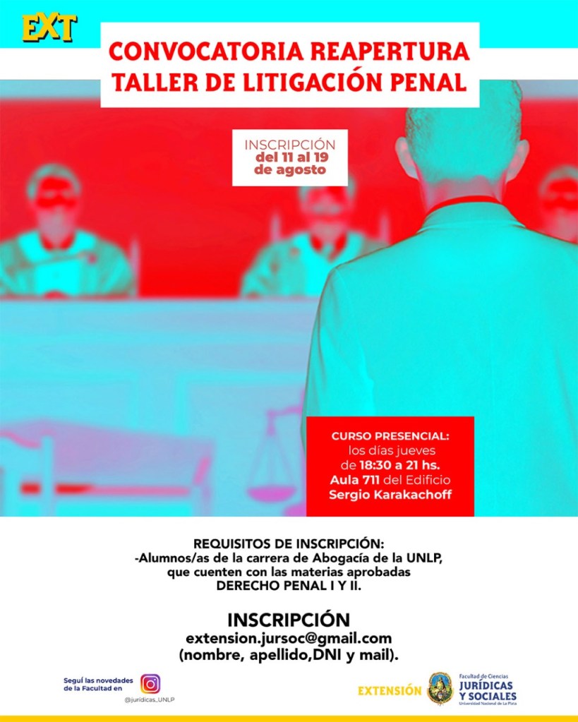 La Secretaría de Extensión Universitaria informa que se encuentra abierta la inscripción a la Convocatoria «Taller de Litigación Penal 2022» el cual se dictará de manera presencia los días jueves de 18:30 a 21:00 hs., en el aula 711 Edificio Sergio Karakachoff.