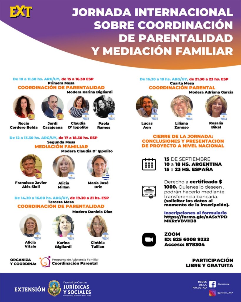 Informamos que se encuentra abierta la inscripción a la «JORNADA INTERNACIONAL SOBRE COORDINACIÓN DE PARENTALIDAD Y MEDIACIÓN FAMILIAR «, organizada por la Secretaría de Extensión Universitaria y el Programa de Asistencia Familiar-Coordinación de parentalidad, la misma se llevará a cabo el día jueves 15 de septiembre de 10 a 18 hs. (Argentina) y de 15 a 23 hs. (España) a través de la plataforma ZOOM.