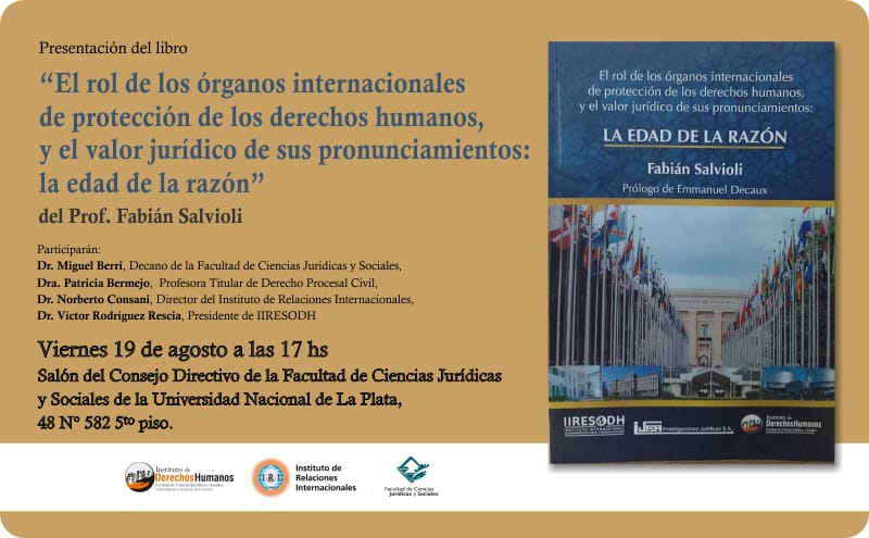 El Instituto de Derechos Humanos y el Instituto de Relaciones Internacionales tienen el agrado de invitarles a la presentación del libro del Prof. Dr. Fabián Salvioli, «El rol de los órganos internacionales de protección de los derechos humanos, y el valor jurídico de sus pronunciamientos: la edad de la razón»