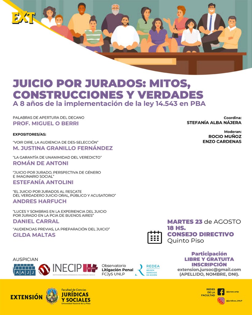 La Secretaría de Extensión Universitaria invita a participar del Conversatorio “Juicio por Jurados: mitos, construcciones y verdades. A 8 años de la implementación de la ley 14.543 en la provincia de Buenos Aires” organizada por esta secretaría, la cual se llevará a cabo el día martes 23 de agosto a las 18:00 hs. en el Salón Consejo Directivo (5°piso, Edificio de la Reforma) Facultad de Ciencias Jurídicas y Sociales.
