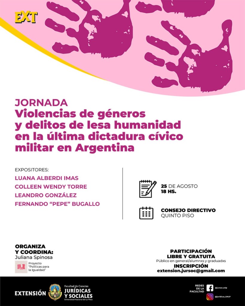 La Secretaria de Extensión Universitaria los invita a participar de la «Jornada Violencias de géneros y delitos de lesa humanidad en la última dictadura cívico militar en Argentina», la cual se llevará a cabo el día jueves 25 de agosto a las 18 hs en el Salón del Consejo Directivo (5to piso-Edificio de la Reforma).
