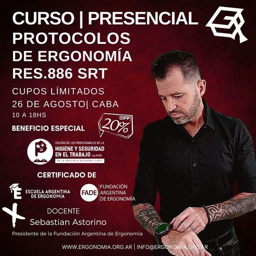 El Colegio de Profesionales de la Higiene y Seguridad en el Trabajo de la Provincia de Buenos Aires junto a la Fundación Argentina de Ergonomía ofrece un BENEFICIO ESPECIAL del 20% off para el Curso Presencial «Protocolos de Ergonomía»