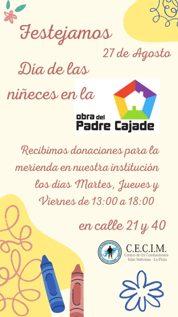 Este fin de semana serviremos la merienda en el Hogar del Padre Cajade para la celebración del día de la niñez. Estaremos recibiendo donaciones en nuestra sede de 21y40: leche, chocolatada, galletitas y alimentos no perecederos.