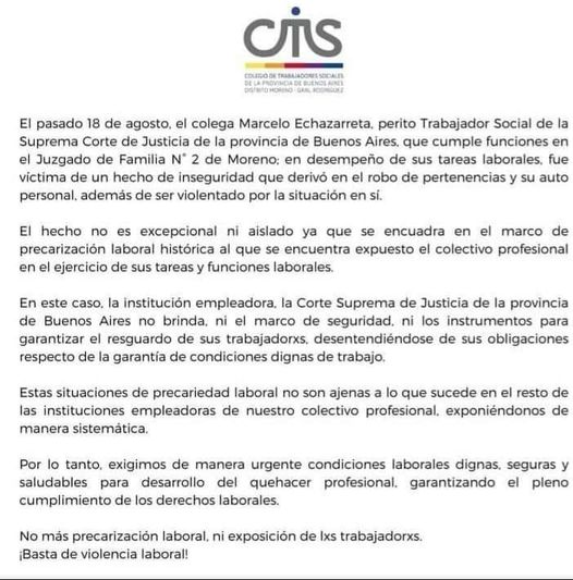 La Mesa Ejecutiva del Colegio de Trabajadores Sociales de la Provincia de Bs. As. se suma a la visibilización de la situación que atravesó el Lic. Marcelo Echazarreta en el marco de su intervención profesional en la ciudad de Moreno.