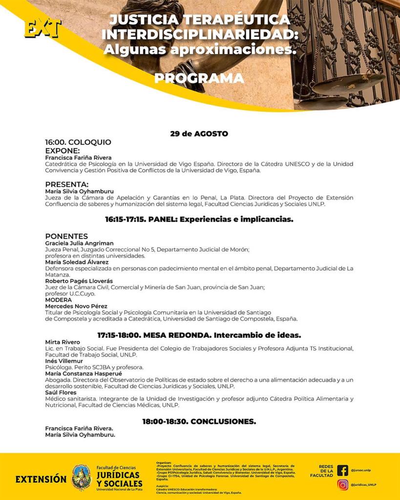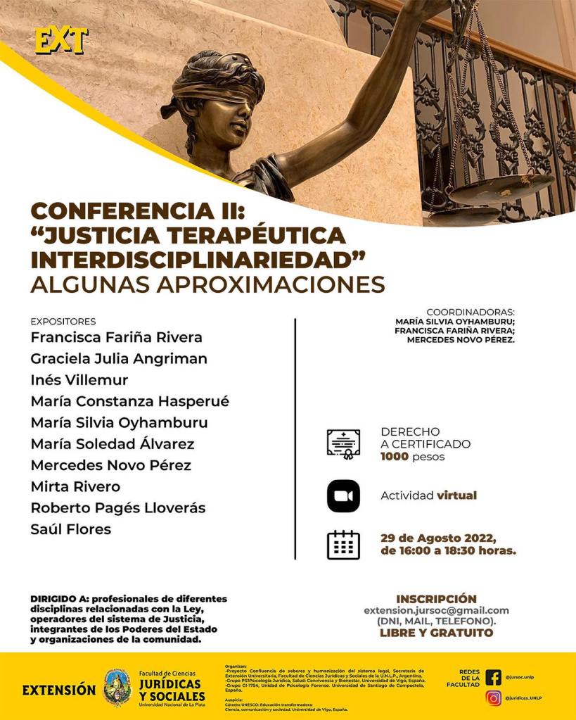La Secretaría de Extensión Universitaria invita a participar de la Conferencia II: “Justicia Terapéutica – Interdisciplinariedad”. Algunas aproximaciones, organizada por el “Proyecto Confluencia de saberes y humanización del sistema legal” dependiente de la Secretaría de Extensión Universitaria de la FCJyS-UNLP, el Grupo PS1 “Psicología Jurídica, Salud: Convivencia y Bienestar” de la Universidad de Vigo-España, el Grupo GI-1754 “Unidad de Psicología Forense” de la Universidad de Santiago de Compostela-España y, auspiciada por la “Cátedra UNESCO: Educación transformadora: ciencia, comunicación y sociedad” de la Universidad de Vigo-España.
