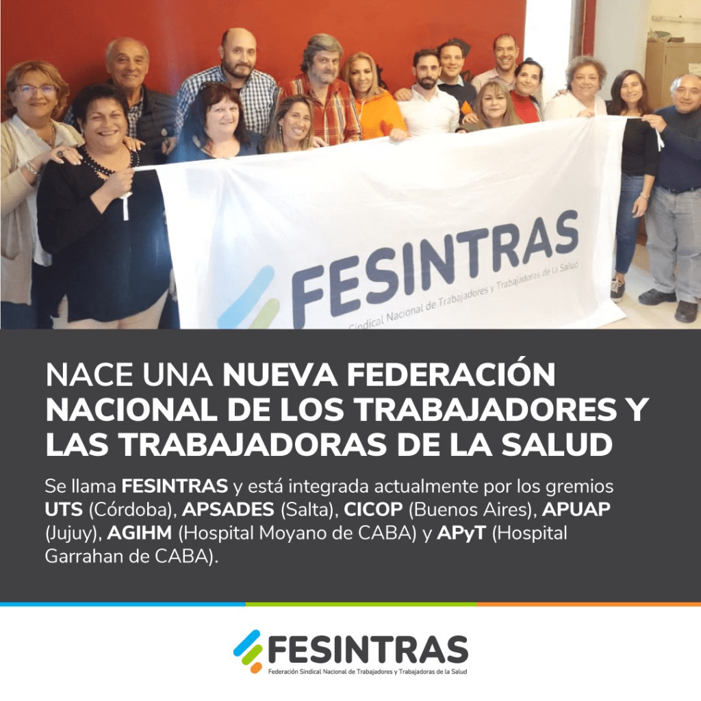 La Federación Sindical Nacional de Trabajadores y Trabajadoras de la Salud (FESINTRAS) está integrada actualmente por los sindicatos: UTS (Unión de Trabajadores de Salud de la Provincia de Córdoba), APSADES (Asociación de Profesionales de la Salud de la Provincia de Salta), CICOP (Asociación Sindical de Profesionales de la Salud de la Provincia de Buenos Aires), APUAP (Asociación de Profesionales Universitarios de la Administración Pública de Jujuy), AGIHM (Asociación Gremial Interdisciplinaria del Hospital Moyano) y APyT (Asociación de Profesionales y Técnicos del Hospital Garrahan). Se mantienen conversaciones con otras provincias que se sumarían a la nueva Federación.