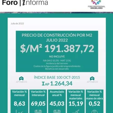 El valor del metro cuadrado de construcción del Gran La Plata promedió en julio $191.387,72