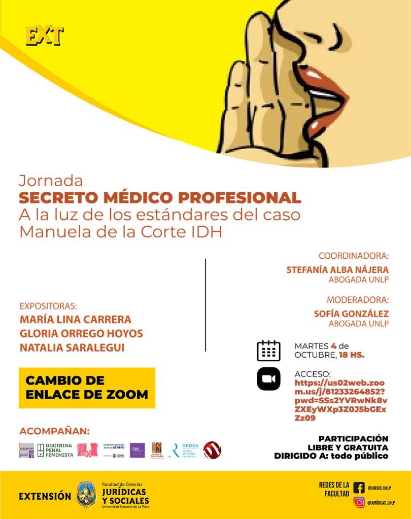 La Secretaria de Extensión Universitaria invita a la comunidad a participar de la Jornada “Secreto Médico Profesional. A la luz de los estándares del caso `Manuela´ de la Corte IDH”, la cual está dirigida al público en general y se llevará a cabo el martes 4 de octubre a las 18 hs. por Plataforma Zoom.