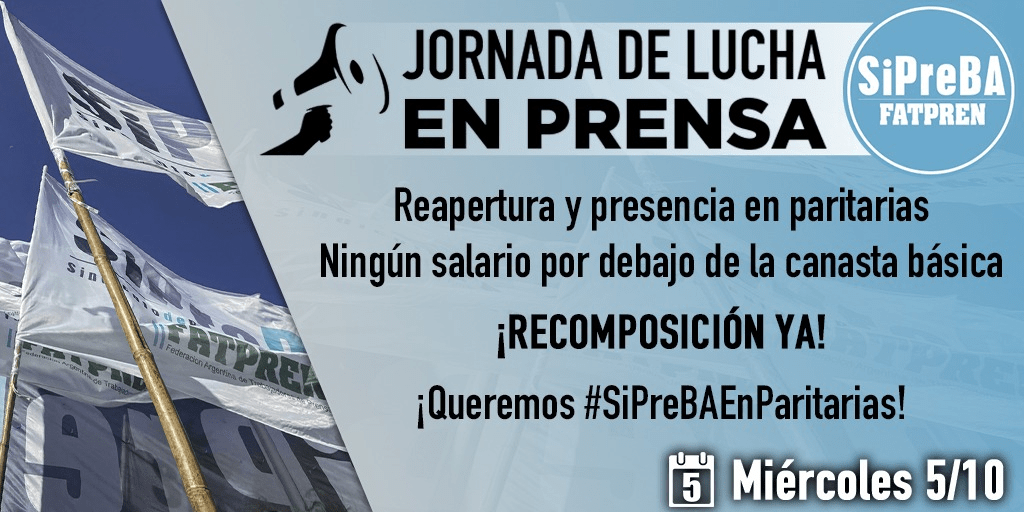 Por resolución del plenario de delegades de todas las asambleas del SiPreBA, y junto a sindicatos de todo el país en la FATPREN, este miércoles 5/10 convocamos acciones en todos los medios en reclamo por reapertura de paritarias y urgente recomposición salarial.