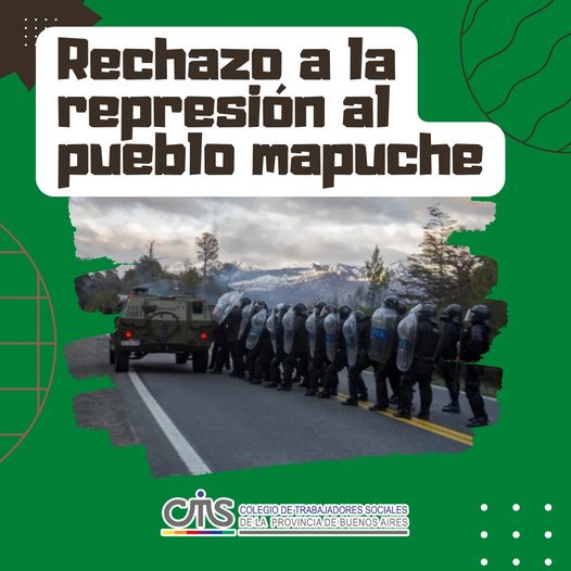 El Colegio de Trabajadorxs Sociales de la provincia de Buenos Aires repudia enérgicamente la violencia institucional en manos de las fuerzas de seguridad nacional en la zona de Villa Mascardi, quienes han concretado con más de 200 efectivos una brutal represión y desalojo de la comunidad mapuche Lafken Winkul Mapu, que se encuentra ejerciendo el derecho a la recuperación territorial ancestral.