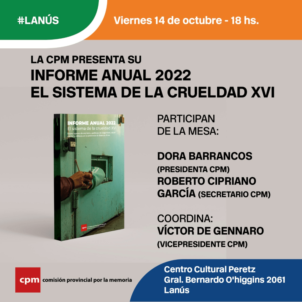 Este viernes presentamos nuestro informe anual sobre lugares de encierro, políticas de seguridad, encierro, niñez y salud mental en la provincia de Buenos Aires; en el Centro Cultural Peretz.