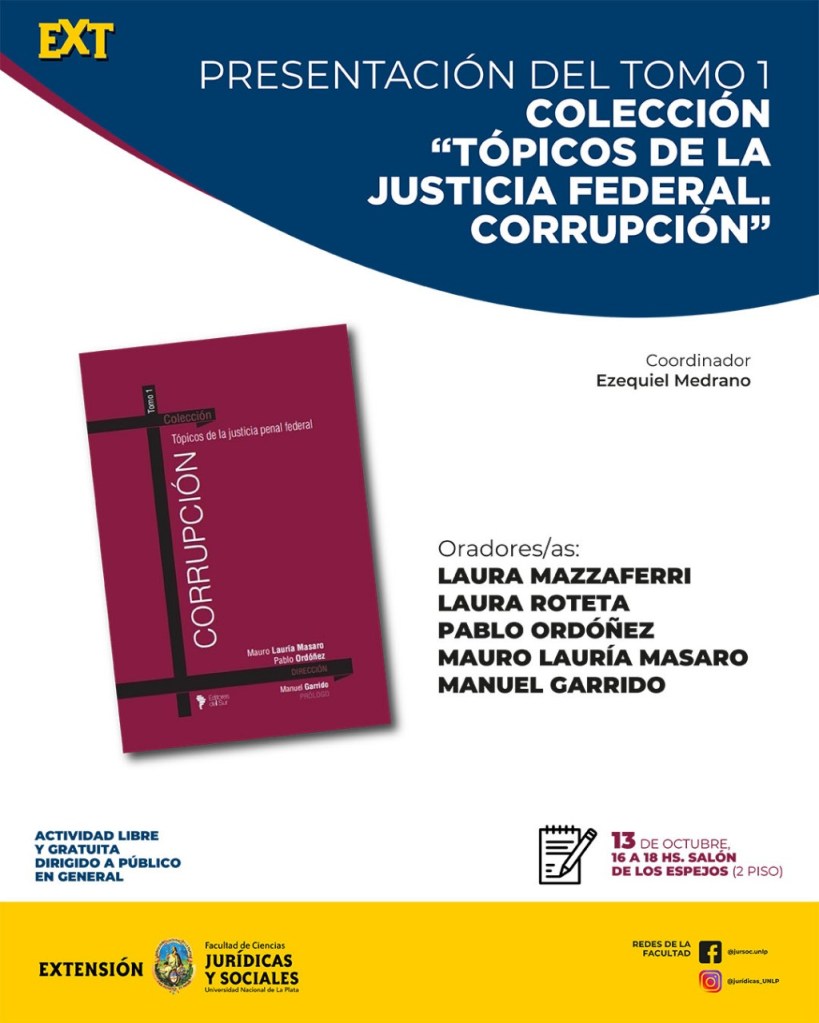 La Secretaría de Extensión Universitaria invita a participar de la Presentación del Tomo 1 – Colección “Tópicos de la justicia federal. CORRUPCIÓN”, obra bajo la dirección de Mauro LAURÍA MASARO y Pablo ORDÓÑEZ, y prólogo de Manuel GARRIDO, la cual está dirigida a público en general y se llevará a cabo de manera presencial el jueves 13 de octubre a las 16:00 hs. en el Salón de los Espejos.