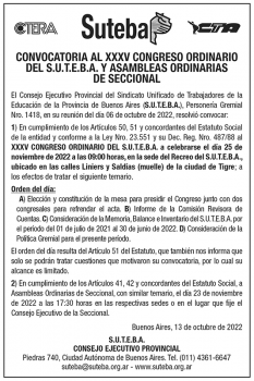 1) En cumplimiento de los Artículos 50, 51 y concordantes del Estatuto Social de la entidad y conforme a la Ley Nro. 23.551 y su Dec. Reg. Nro. 487/88 al XXXV CONGRESO ORDINARIO DEL S.U.T.E.B.A., a celebrarse el día 25 de noviembre de 2022 a las 09:00 horas, en la sede del Recreo del S.U.T.E.B.A., ubicado en las calles Liniers y Saldías (muelle) de la ciudad de Tigre; a los efectos de tratar el siguiente temario.