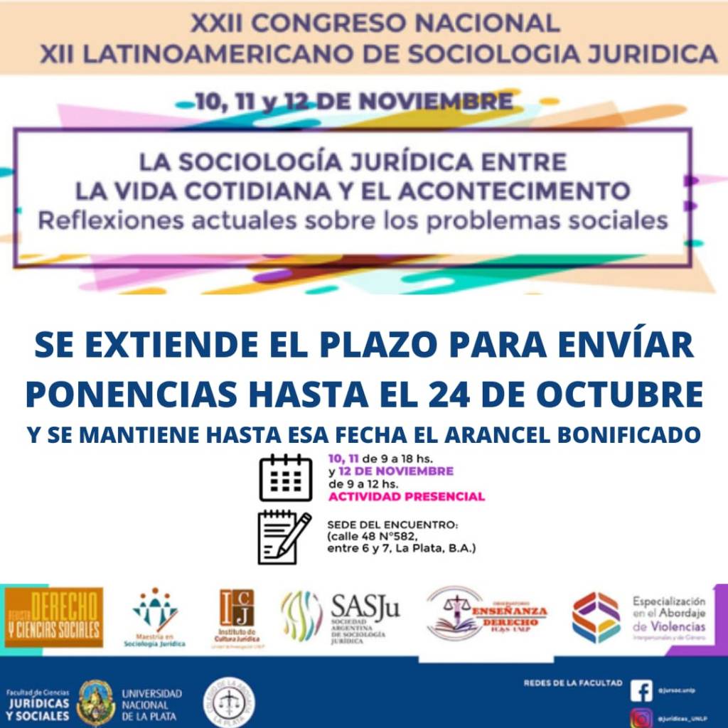 Reflexiones actuales sobre problemas sociales» y se celebrará los días 10, 11 y 12 de noviembre de 2022 en la Facultad de Ciencias Jurídicas y Sociales de la UNLP, ciudad de La Plata, Bs. As., Argentina.