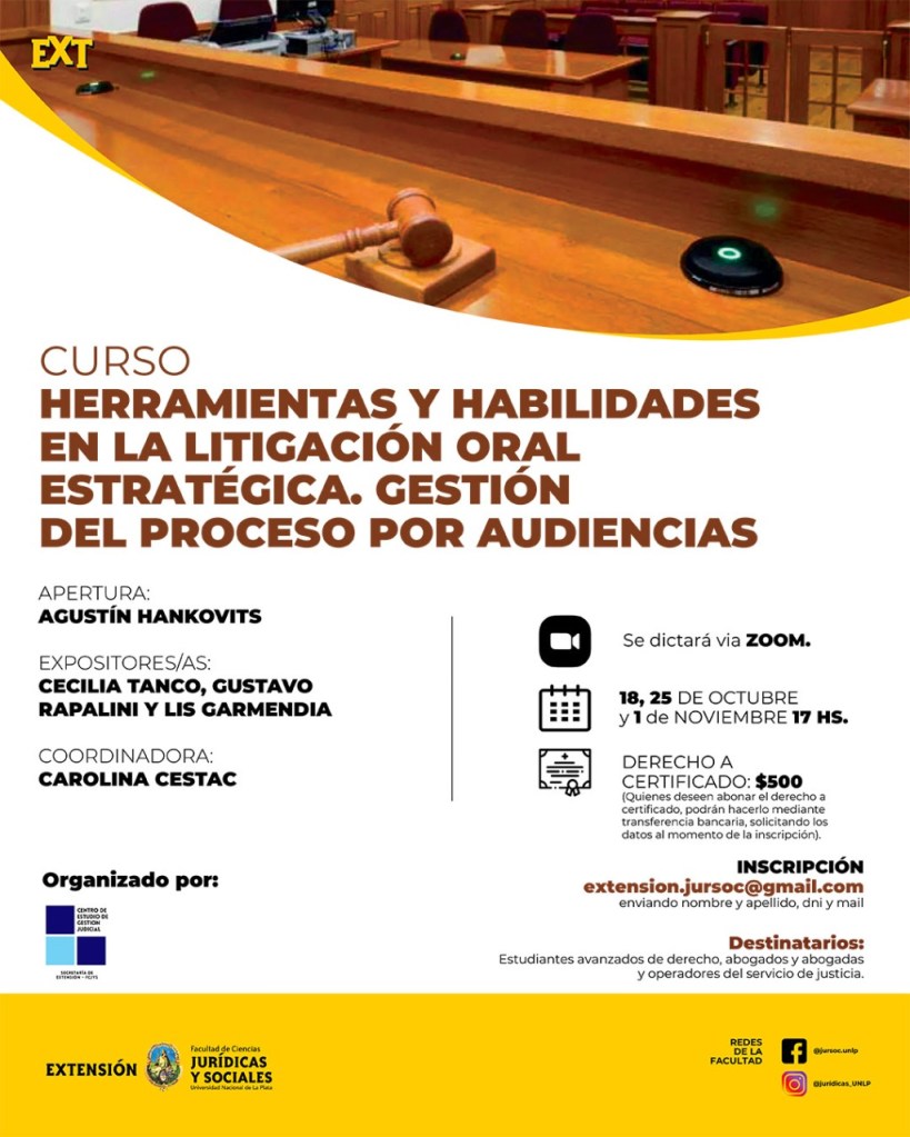 La Secretaria de Extensión Universitaria invita a participar del “Curso Herramientas y habilidades en la litigación oral estratégica. Gestión del proceso por audiencias», organizado por el Centro de estudios de Gestión Judicial de la Facultad de Ciencias Jurídicas y Sociales, el cual se dictará de manera virtual los días martes 18, 25 y 1 de noviembre de 17 hs. a través de la plataforma ZOOM.